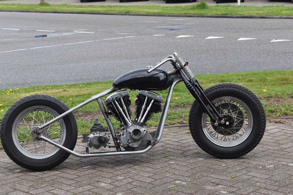Optie 5: Frame met Springer voorvork, 4-versnellingsbak, 3 inch beltdrive en een Shovel motorblok.