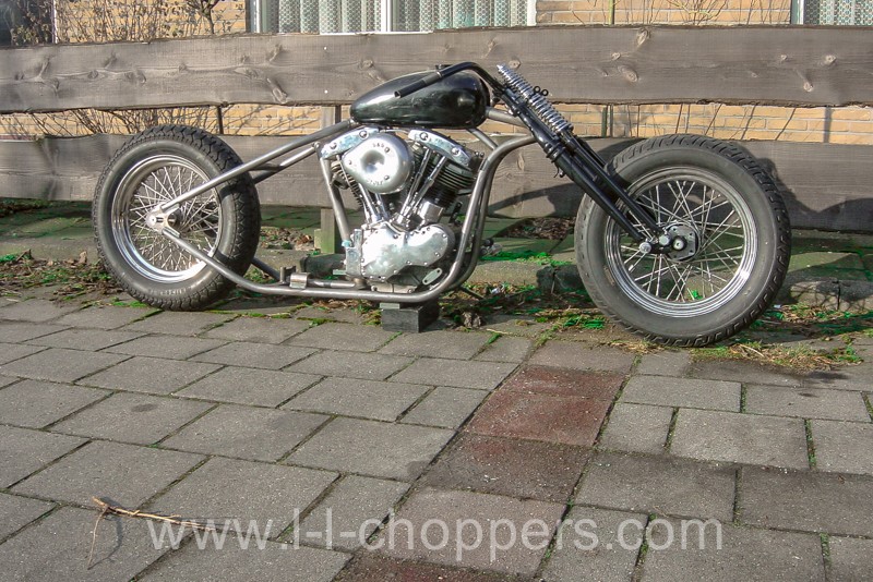 Je zien ze tegenwoordig wat minder, maar de shovelhead blijft een mooi motorblok om een ruig bakkie* te maken (* Chopper). We hebben hier een Hardtail frame gebruikt met een springer die wat onderuit is geplaatst.