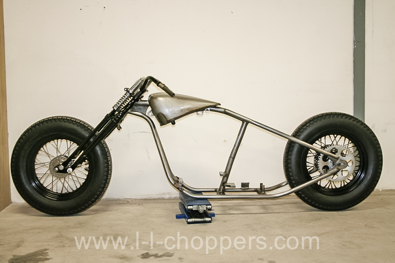Voor een klant hebben we het blok, de bak en het achterwiel uitgelijnd. Verder is er ook een lange springer gemonteerd en vervolgens is de tank bevestigd.