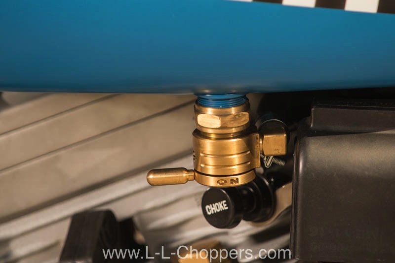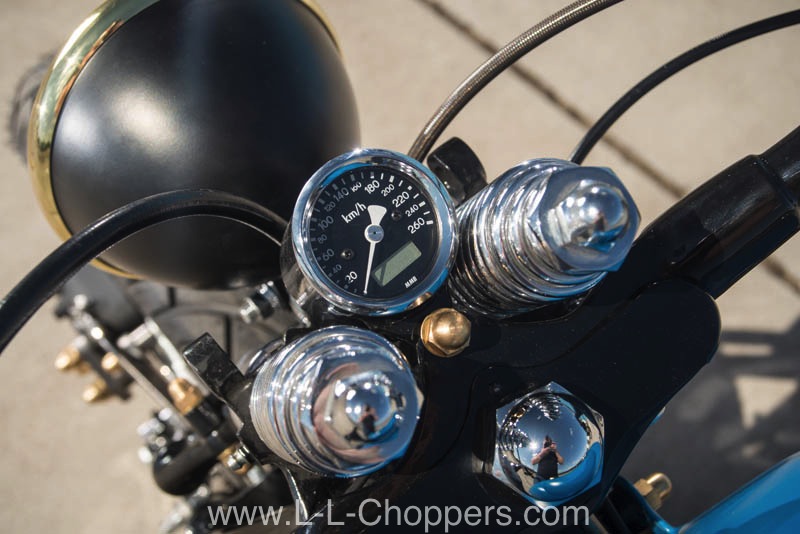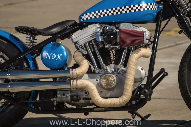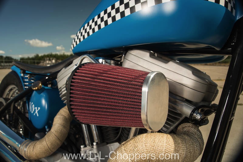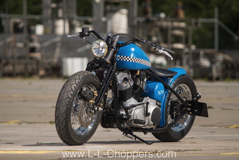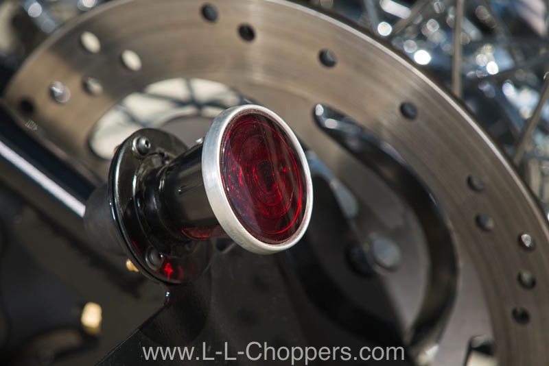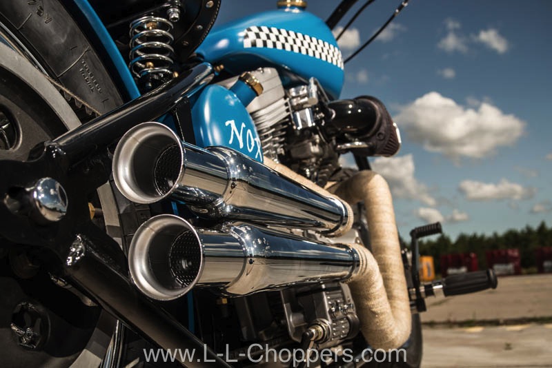 Om de gewenste dikke look te realiseren werd bewust gekozen voor een 200 mm achterband. De voorkant oogt klassiek dankzij de Liberator stijl spinger vork, in combinatie met een brede tank. L&L Choppers had de vrije hand gekregen, met uitzondering van de race luchtfilter. Deze moest er van Bert perse op om oud en nieuw te combineren. De bobber moest vooral robuust gaan worden en daarom werd een flatbender met rand boven het achterwiel gemonteerd. In opdracht van Bert werd de originele, ietwat lompe voorrem hergebruikt. Niet iets wat L&L vaak doet, maar in combinatie met de messing dopmoeren is het resultaat zeker niet verkeerd geworden!