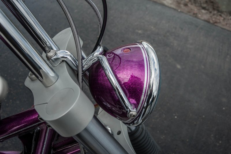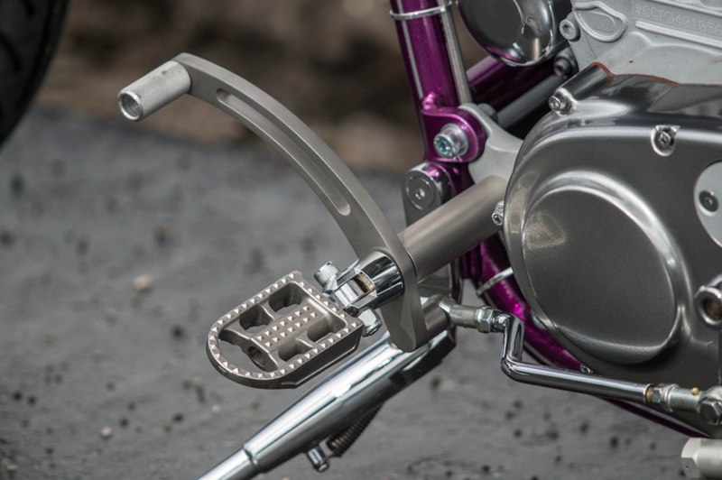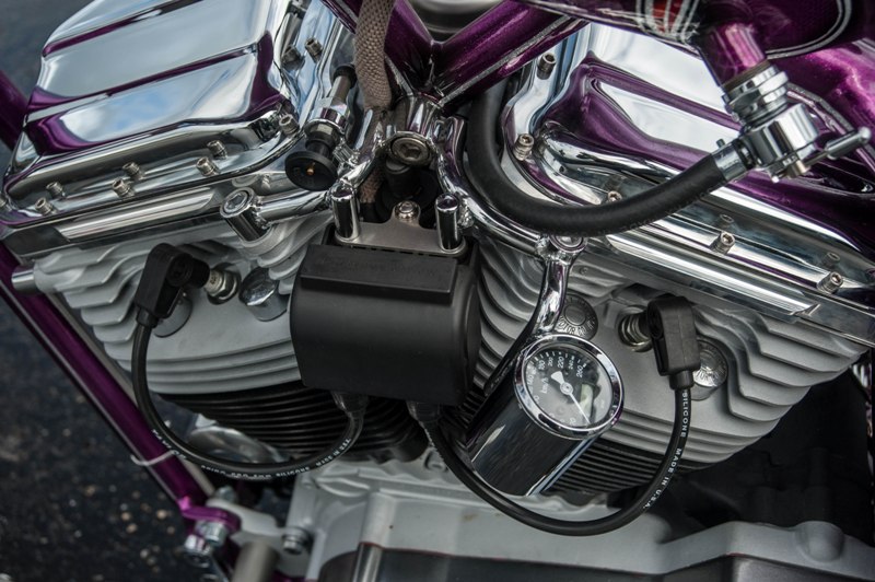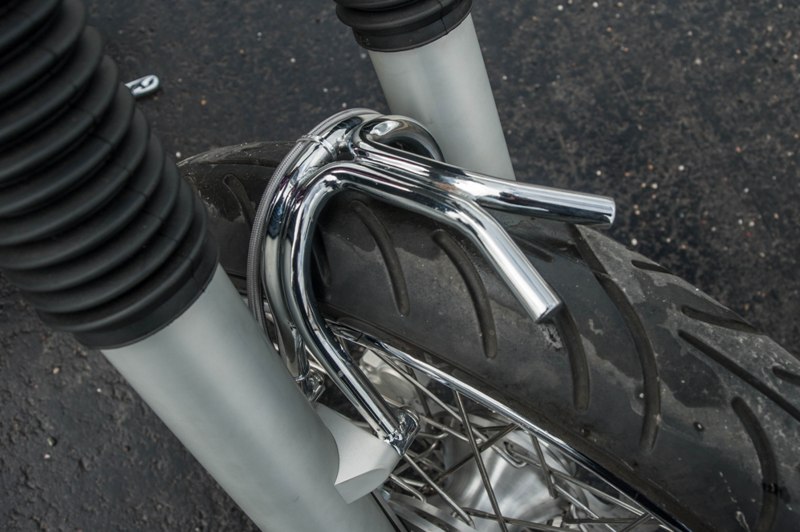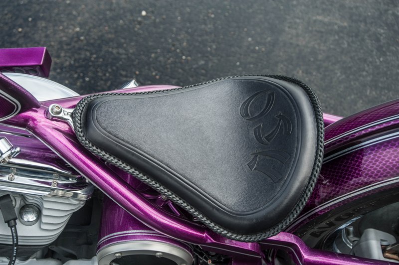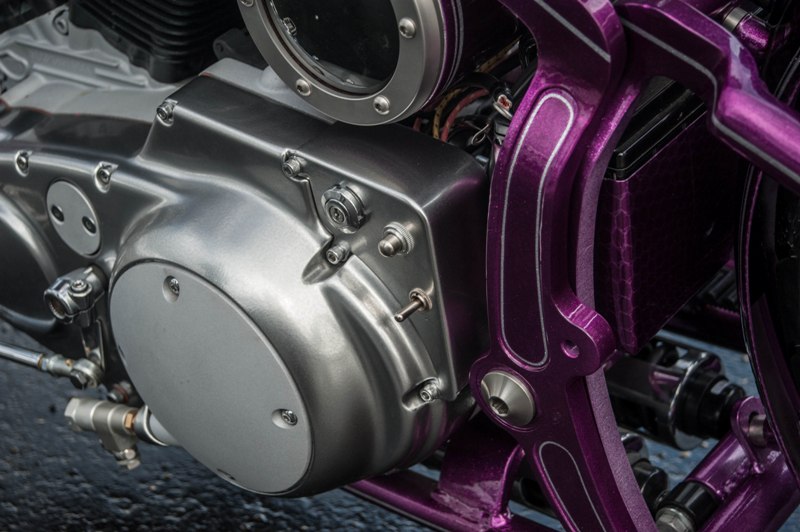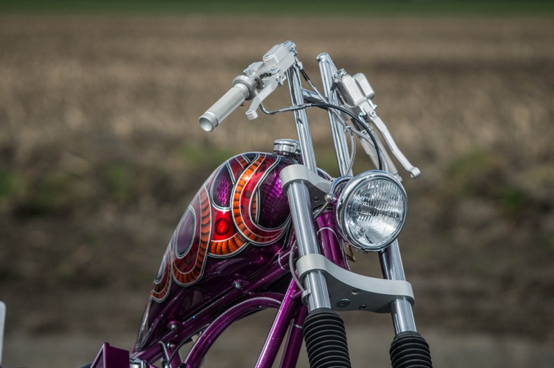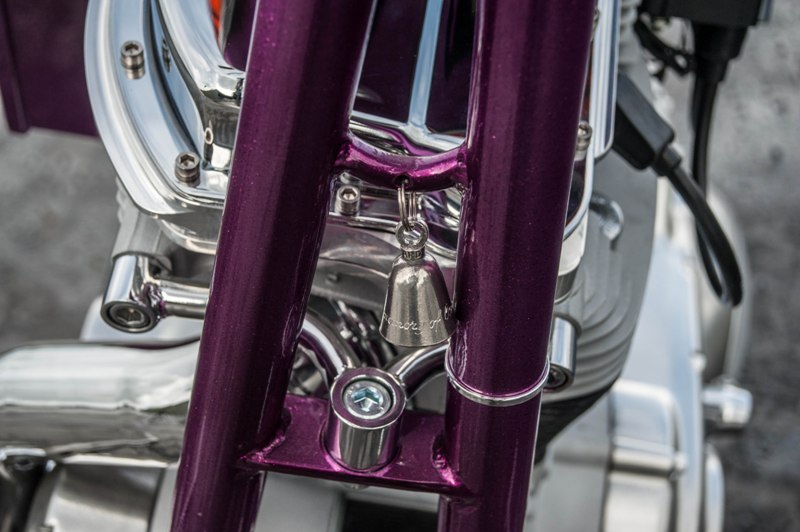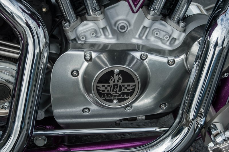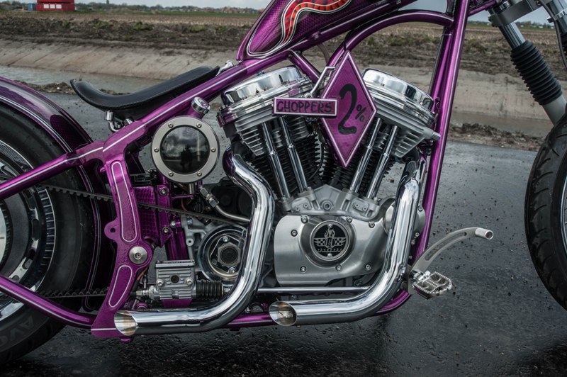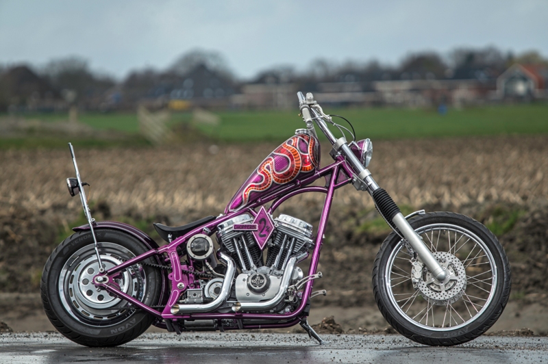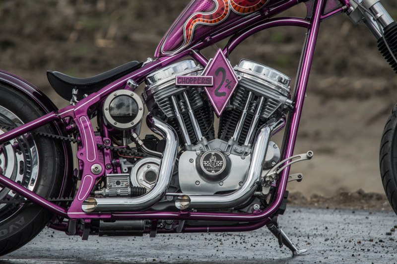 Het softail highneck frame werd speciaal gemaakt naar Yke’s wens. Een nieuwe vork werd gebruikt omdat de standaard vork niet geschikt was voor dubbele schijf. Het smalle tankje is in-house door Paul gefabriceerd. Net als de sissybar, die exact dezelfde vorm heeft als de fork-brace. Het Sportster-blok is volledig aangepakt en omgebouwd naar Panhead look. De vorm van de uitlaten sluit daar helemaal bij aan. Momenteel zie je veel L&L fietsen met een ‘see-trough’ olietank. Die van Yke was één van de eerste: écht een succes! Ook handgemaakt is het coole luchtfilter, met de 2% Choppers patch.