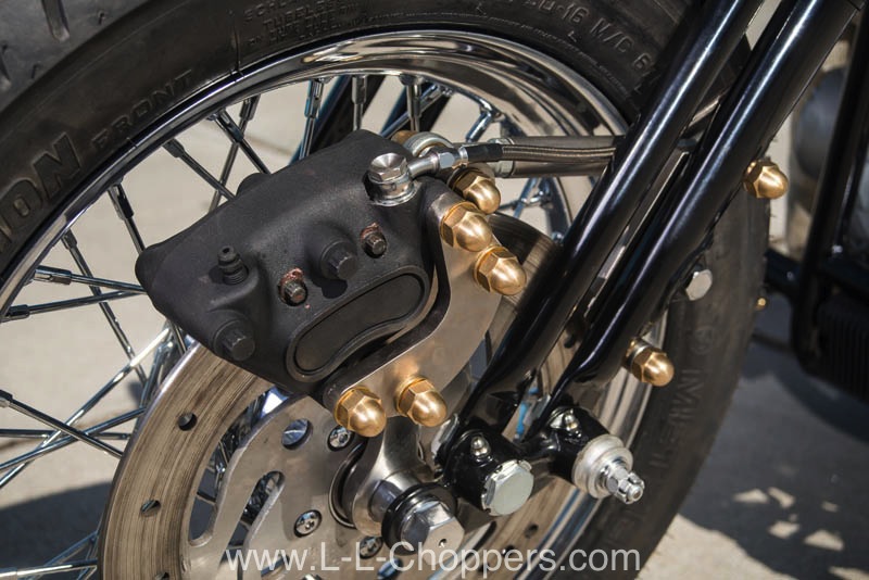 De stock voorrem oogt toch fraai dankzij de messing dopmoeren.