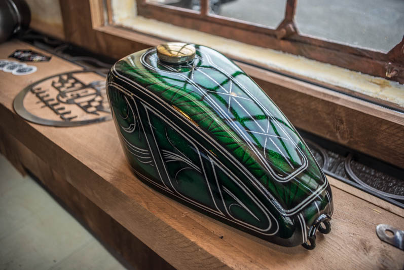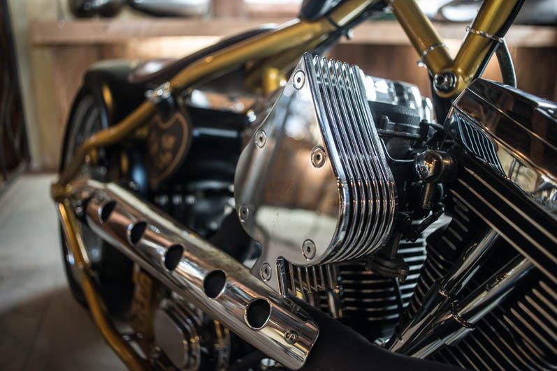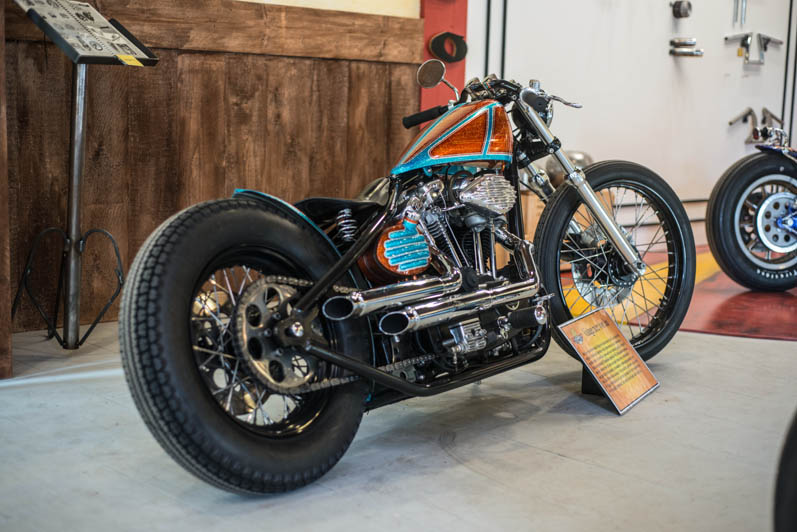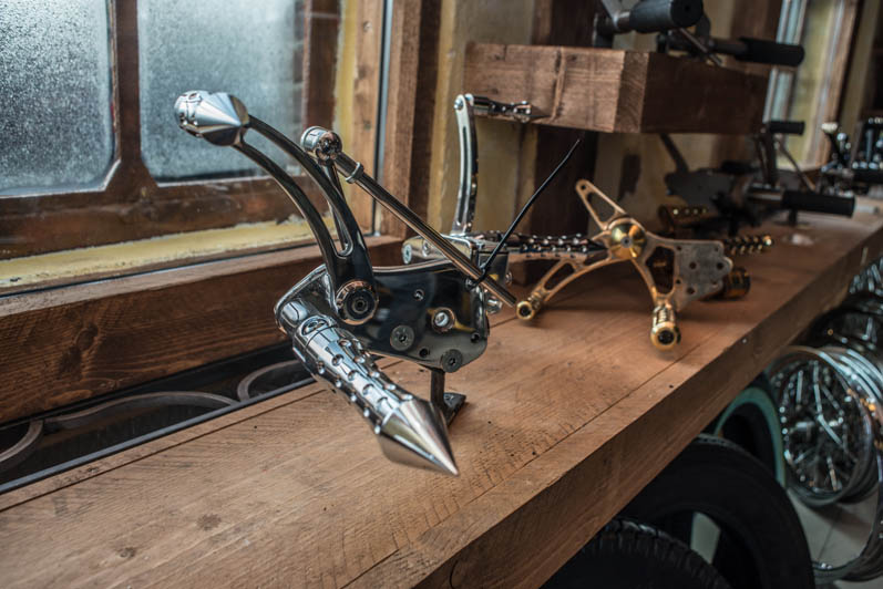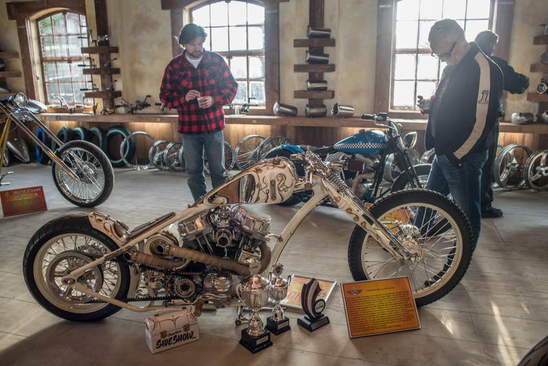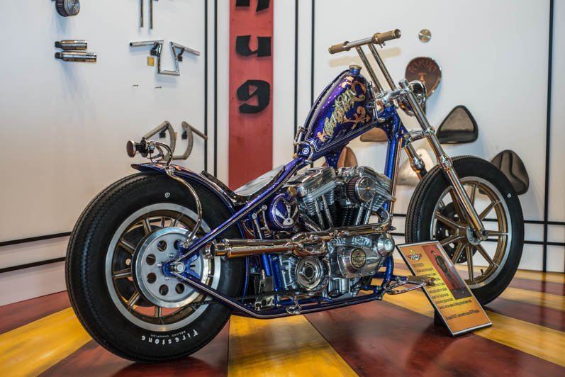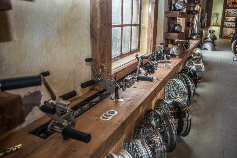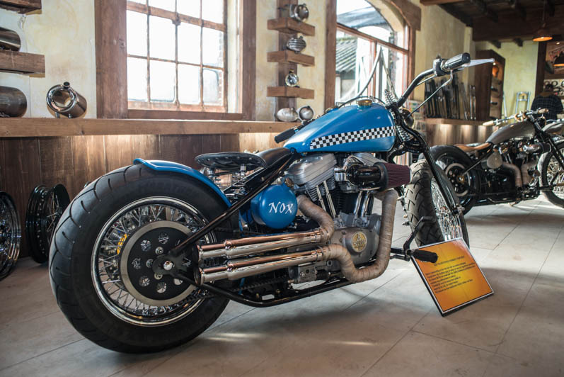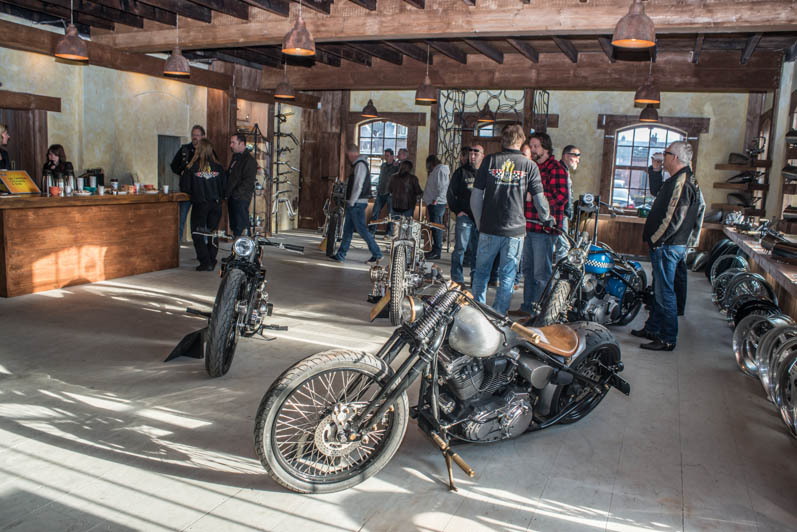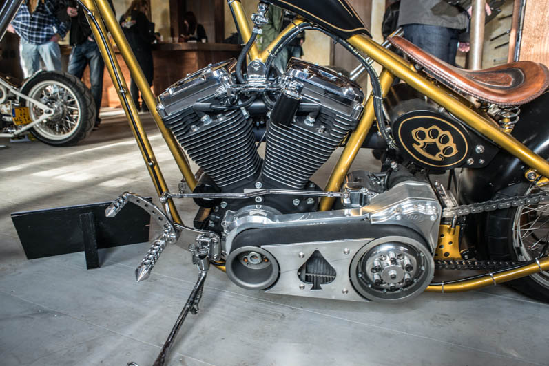 December 28th & 29th 2013 the doors were publicly opened for the first time. The castle-like interiour is realised with help of the Nimeto school. Eye-popping was the special Tokyo Thug corner with Japanese chopper parts. L&L Choppers have put a few of their best bikes in the brand new show-room. Two big-twin highnecks stood on both sides of the raw metal entrance. Central to the showroom was the trophee-winning Panster of L&L’s engineer Paul. An unfinished Buell rigid chop in English streetfighter tradition looked very promising, ans so was the raw Attackit Sportster of L&L’s helper Richard.
